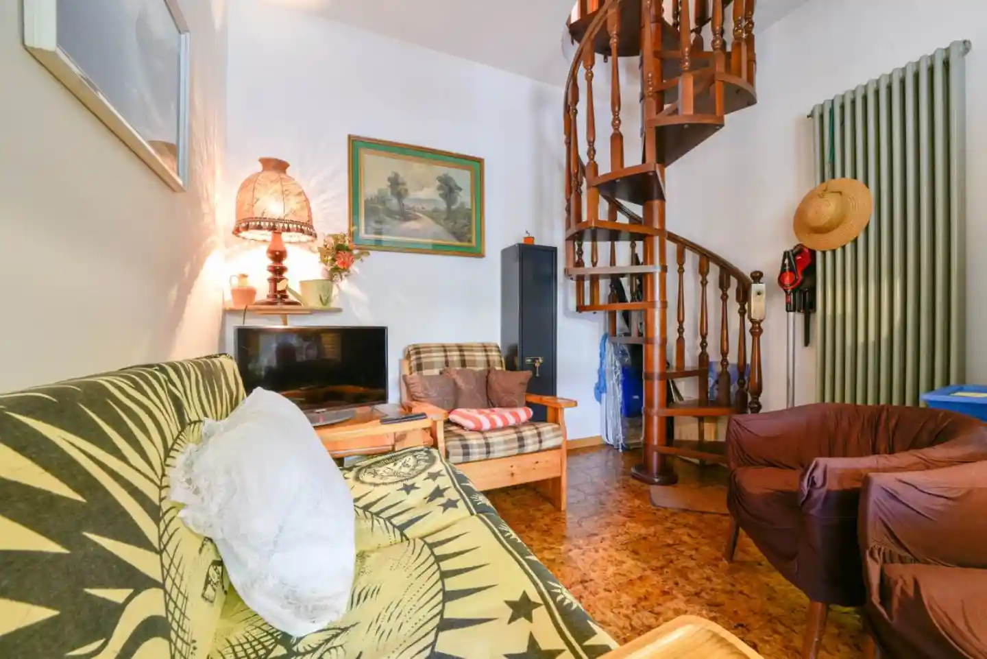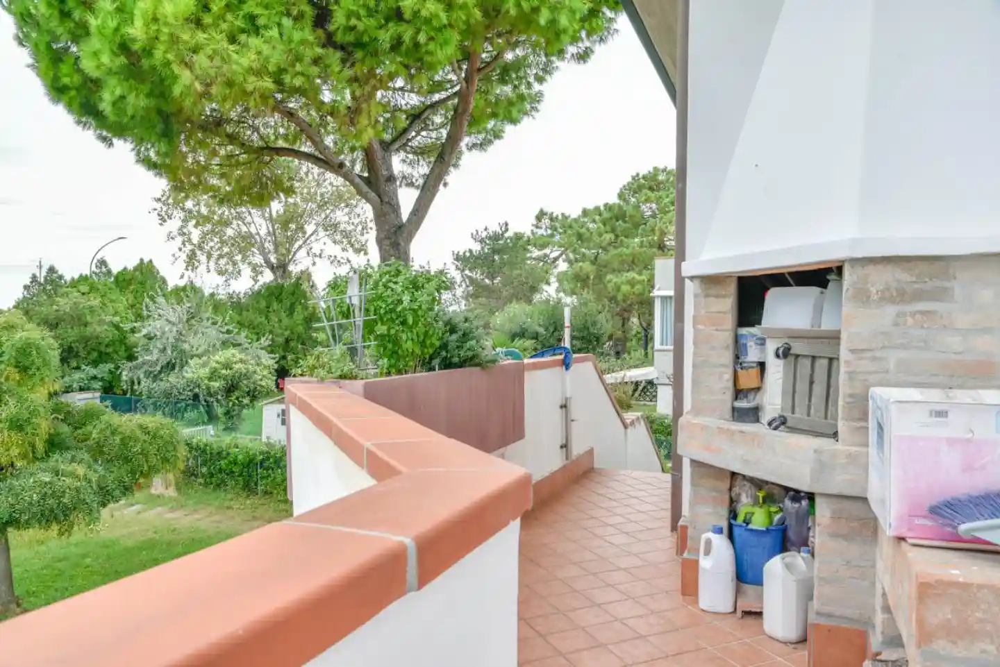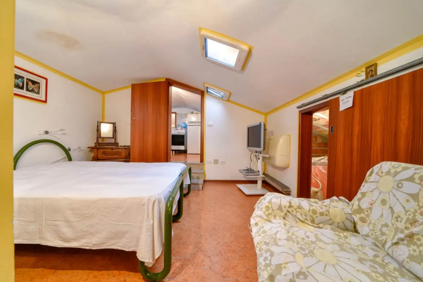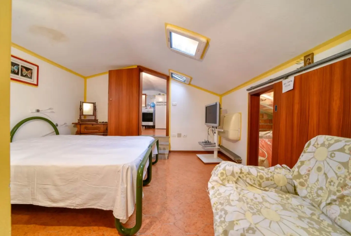 L’ingresso all’abitazione avviene tramite una scala esterna che conduce al primo piano, dove un ampio balcone con caminetto per barbecue introduce al soggiorno, luminoso e accogliente, affiancato da un cucinotto finestrato e funzionale.