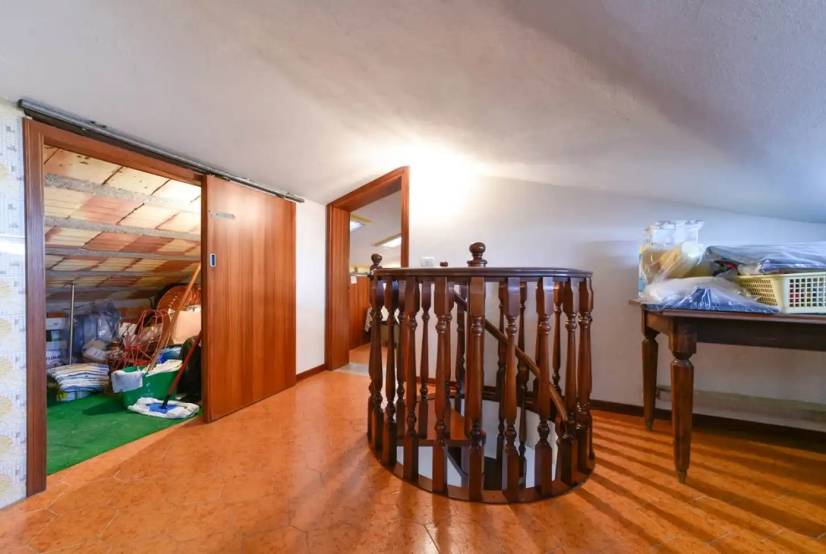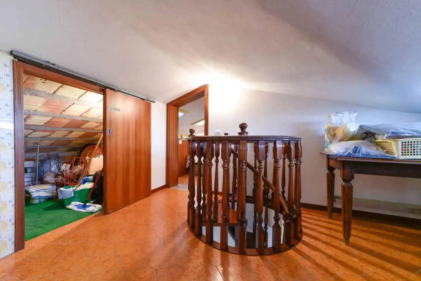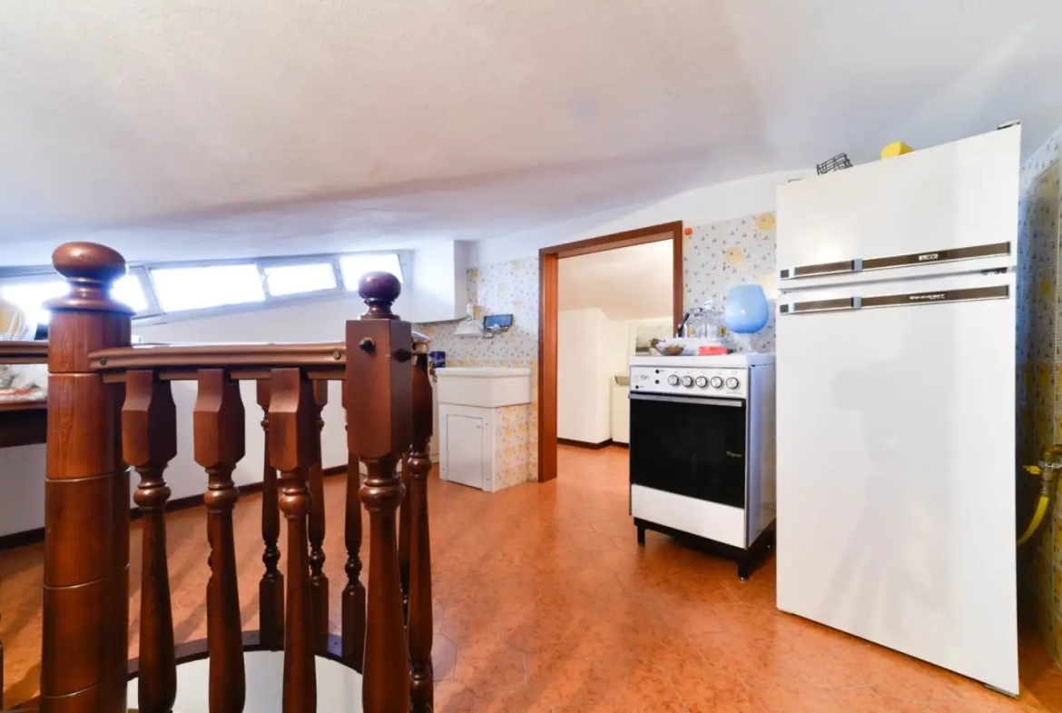 Dal salotto si accede, tramite una comoda scala a chiocciola, all’area mansardata che si apre su un ampio disimpegno con angolo cottura.
