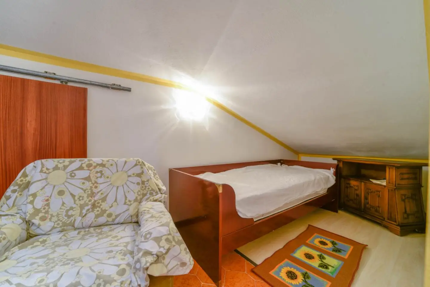 Qualche gradino separa la zona giorno dalla zona notte, composta da un corridoio, un bagno di servizio/lavanderia, una camera matrimoniale luminosa, un bagno con doccia a filo pavimento e una cameretta doppia con balcone sul retro della casa.